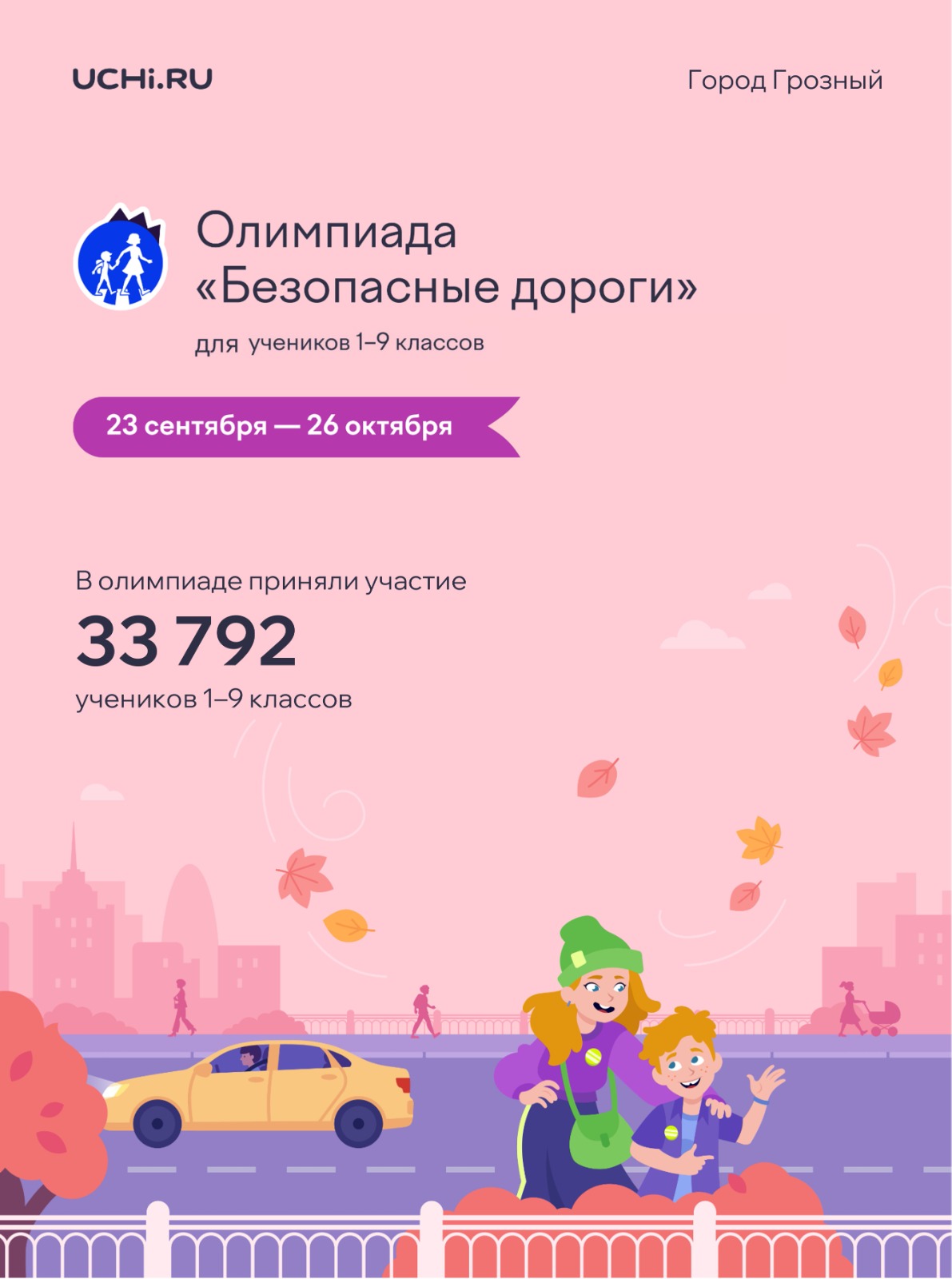 23.10.2025Осталось семь дней до завершения первого тура бесплатной всероссийской олимпиады «Безопасные дороги». К соревнованию уже присоединились 33.792 учеников города. Чтобы все желающие успели принять участие в состязании, поделитесь ссылкой с учителями: https://clck.ru/3PM6fG